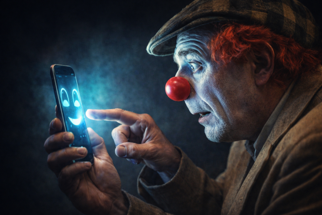 Avec humour, un personnage profondément humain face à son smartphone.